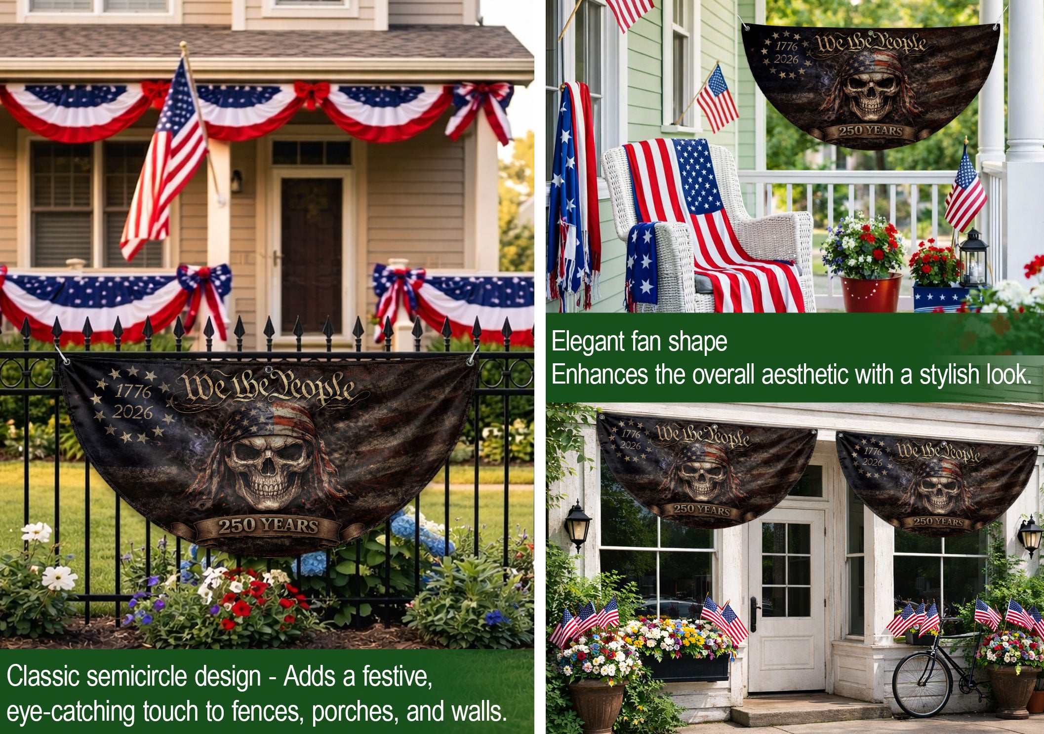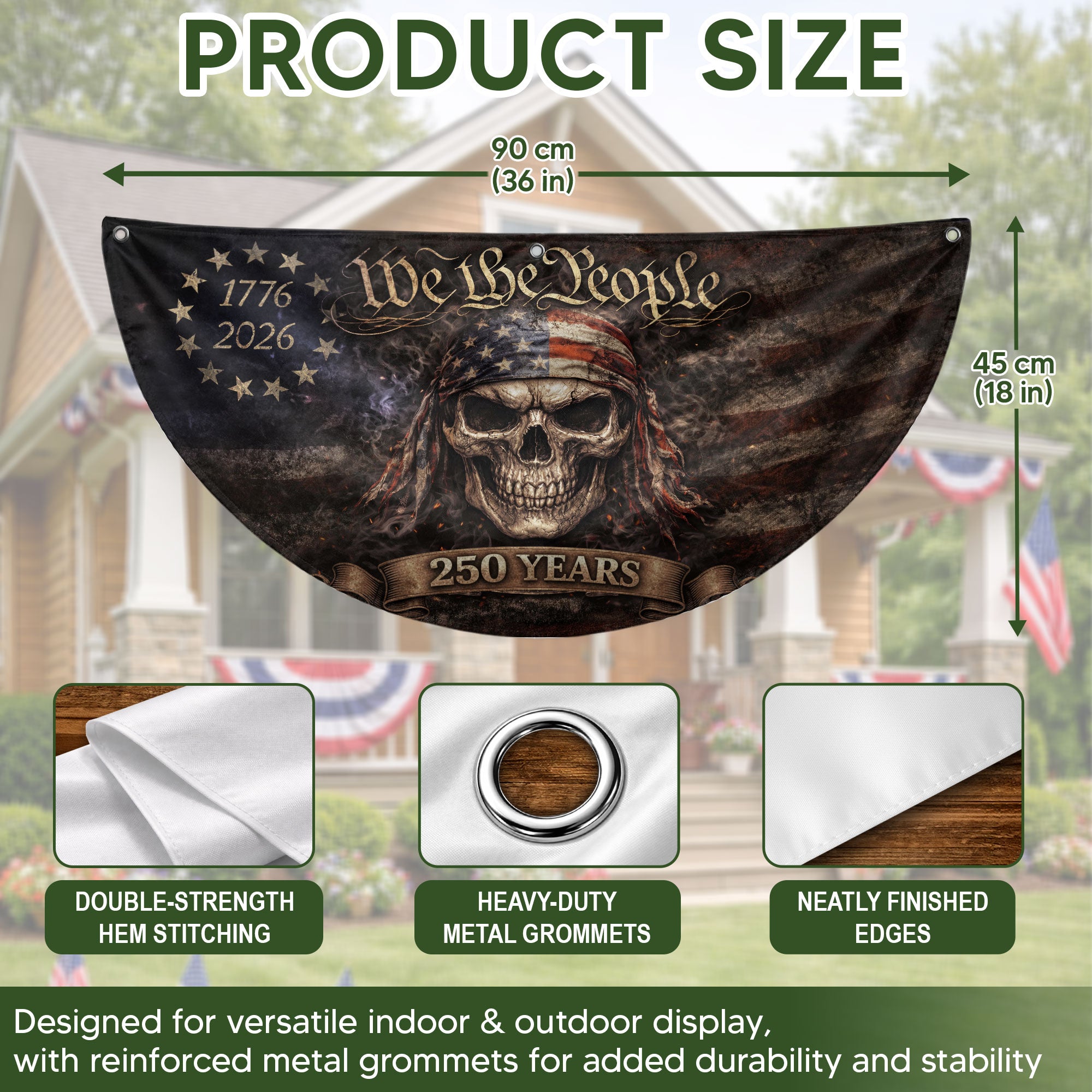 Celebrate America’s 250th anniversary from 1776 to 2026 with the We The People Skull Fence Flag. This double-sided patriotic banner features a bold skull design in rugged vintage American style, perfect for displaying your pride on fences, patios, porches, or any outdoor space. Crafted from high-quality, durable, weather-resistant fabric, it withstands wind, rain, and sun exposure for long-lasting vibrancy. Easy to hang with reinforced edges and grommets, this garden flag measures standard size for versatile use in yards, decks, or events. Ideal for patriots honoring the nation’s history and future.
